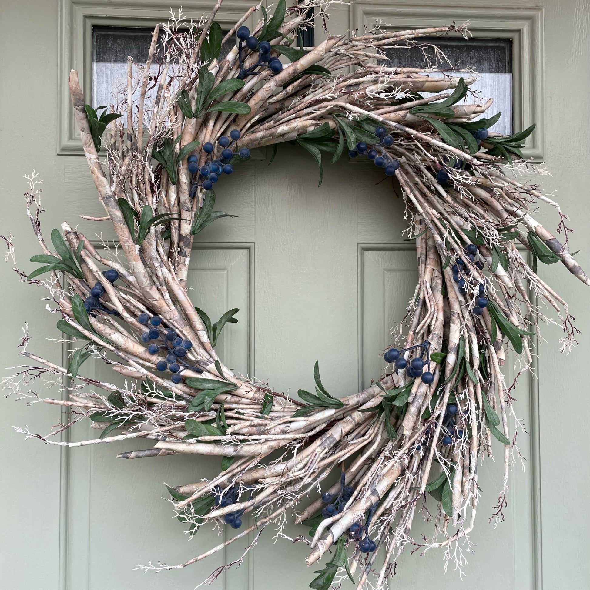 Dress your door in style, with our blueberry wreath. Crafted from a mix of high quality faux foliage including pretty green leaf sprigs set on a rustic twig base.